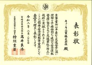宮崎県 自動車安全運転センター 様より、優秀安全運転事業所として表彰を受けました。